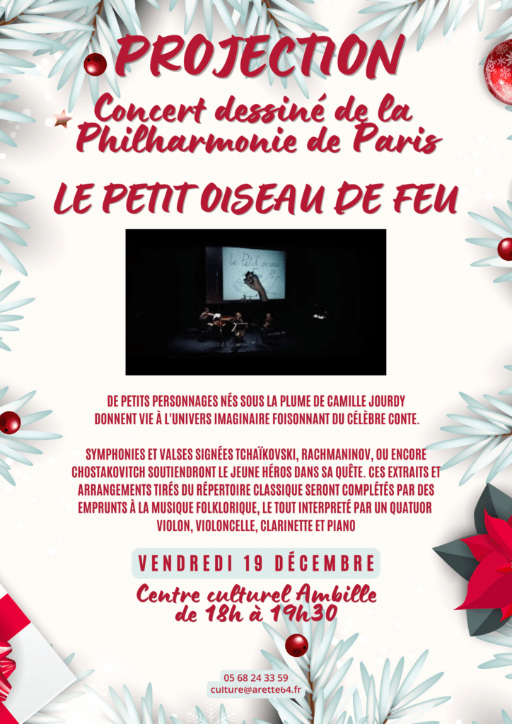 Projection « Concert de la Philarmonie de Paris » Concert » le petit oiseau de Feu » Vendredi 19 Décembre – de 18h00 à 19h30 Ouvrir dans une autre fenêtre X Ouvrir dans une autre fenêtre Facebook Read more articles Article précédent L’EMIHB anime le Centre culturel Ambille avec ses « Rendez-vous de la musique » Vous devriez également aimer La Pierre-Saint-Martin : une fin de saison aux accents franco-espagnols 28 mars 2024 SPA, balnéo et hébergements : le Pyrénéa campus ouvrira ses portes au public en juillet 2026 11 décembre 2025 Coupure d’eau 7 février 2023